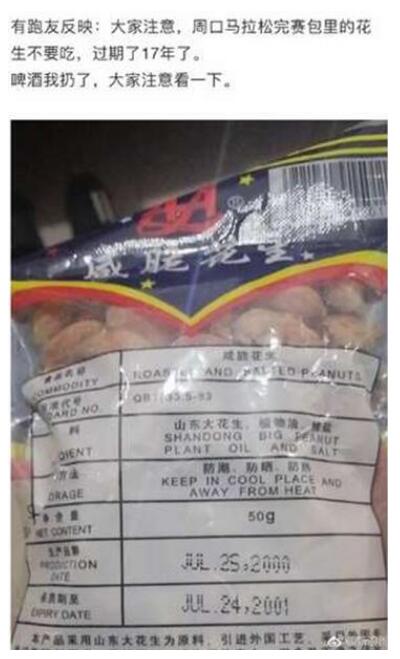 今日,有網(wǎng)友爆料,河南周口馬拉松賽后提供的一包花生,外包裝的生產(chǎn)日期竟然是2000年。北京青年報記者從周口馬拉松組委會了解到,該花生是當(dāng)?shù)匾焕先顺粗疲臼巧⒀b出售,此次為方便組委會才分袋包裝,生產(chǎn)日期是包裝袋有誤,花生本身沒有問題。