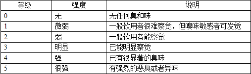 臭和味:去水樣100ml,置于三角瓶中,振搖后聞水的氣味,用適當(dāng)?shù)脑~句描述,并按六級(jí)記錄其強(qiáng)度。同時(shí)取少量的水入口,不要下咽,嘗嘗水的味道,并加以描述,按六級(jí)記錄其強(qiáng)度。