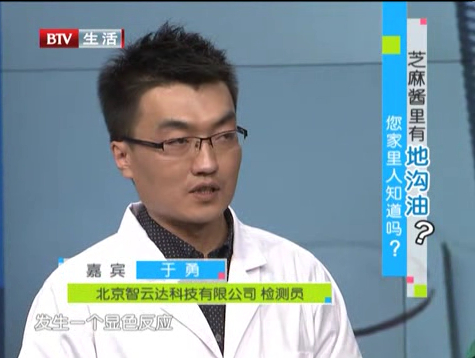 但是這樣還不能解釋謠傳中的芝麻醬里面有地溝油的疑問,于是《生活面對面》欄目組隨食品檢測專家來到北京智云達科技有限公司實驗室。在食品安全快速檢測產品“地溝油”多參數綜合快速篩查箱的輔助下,現場進行“地溝油”快速篩查試驗,此產品是衛生部推薦和認可的快速檢測地溝油的辦法。于老師在芝麻醬上面的浮油中抽取一定量的浮油,分別滴入到4個比色管中,再在比色管中加入地溝油試劑,均勻搖動,最后放到沸水中煮沸。經過五分鐘后取出,然后對4個比色管進行顏色觀察,檢測結果呈現陰性,最后證明芝麻醬里面不含有地溝油,但有可能摻入了別的植物油。