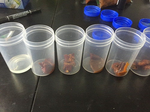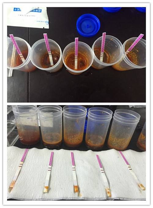 我們隨機取一點火鍋底料,放入干凈的容器中,加入5ml蒸餾水進行溶解,發(fā)現(xiàn)有幾種由于含油量較高,凝結成塊,無法很快溶解,因此我們對其稍微加熱,使得完全溶解。完全溶解后即得到我們的火鍋樣品。
