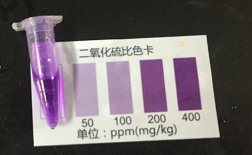 采用二氧化硫速測試管進行檢測,稱取1g枸杞樣本加入蒸餾水49ml,攪拌后靜置10min,之后轉移1ml到離心管中,加入2d二氧化硫檢測試劑A,1d二氧化硫檢測試劑B。攪拌均勻后,5分鐘后用離心管與比色卡進行比色。發(fā)現(xiàn)用二氧化硫的存在。