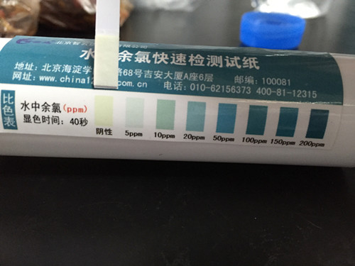 擦掉試紙邊緣多余液體,試紙塊朝上水平放置,40秒時(shí)與色卡比較,讀取結(jié)果。結(jié)果顯示余氯符合國(guó)家標(biāo)準(zhǔn)。