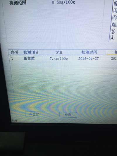 結(jié)果顯示,樣品中蛋白質(zhì)含量為7.4g/100g,與產(chǎn)品包裝標示不符合。
