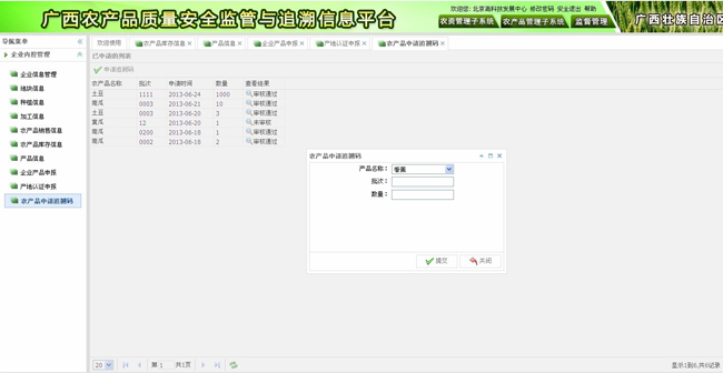 主要功能包括:碼段申請,政府審核,追溯碼段分配,追溯標識管理等。