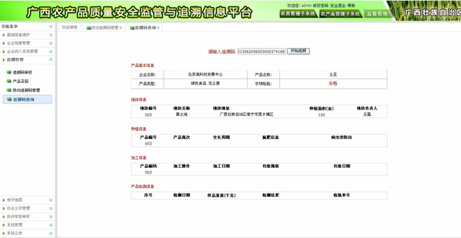 本系統是自治區農產品質量安全信息統一查詢和發布的平臺,根據追溯碼,消費者能夠通過短信、電話、網上查詢等方式,快捷地查詢到農產品全程的質量安全信息。企業農產品溯源信息顯示界面可定制。