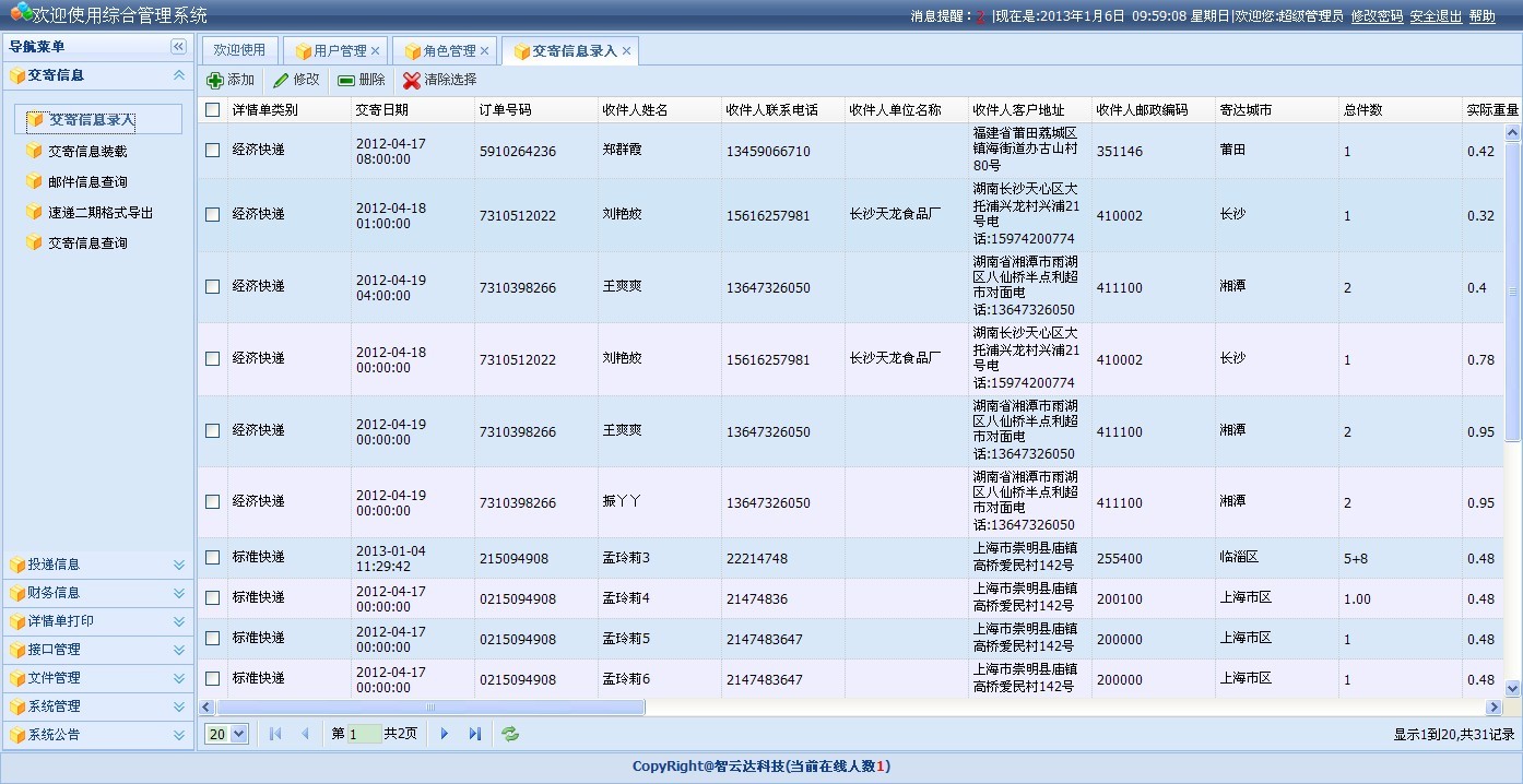 主要用于錄入郵件的交寄信息,并提供增刪改的功能。便于隨時(shí)跟蹤?quán)]件,如下圖所示: