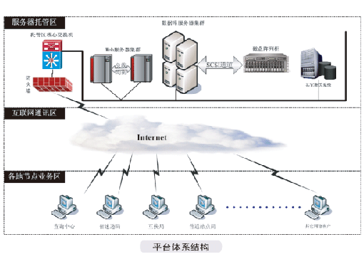 整個系統(tǒng)是建立在以互聯(lián)網(wǎng)連接為基礎的集中式業(yè)務處理系統(tǒng)。其總體結構分為三個層:以服務器托管區(qū)服務器構成的業(yè)務及數(shù)據(jù)處理中心、互聯(lián)網(wǎng)通訊區(qū)、中速及各地的業(yè)務處理節(jié)點,層次結構圖如左所示:
